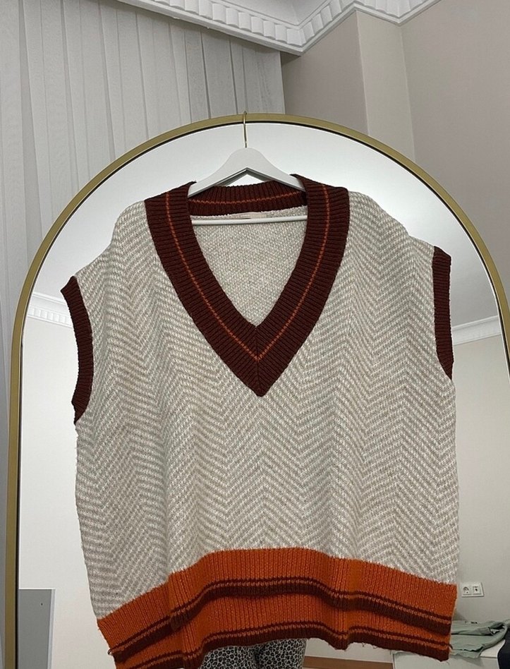 Yün kumaştan, V yaka ve kolsuz tasarıma sahip triko süveter. Gri, kahverengi ve turuncu tonlarıyla bohem, rahat bir görünüm sunar. Midi boy, bol kesimdir.
