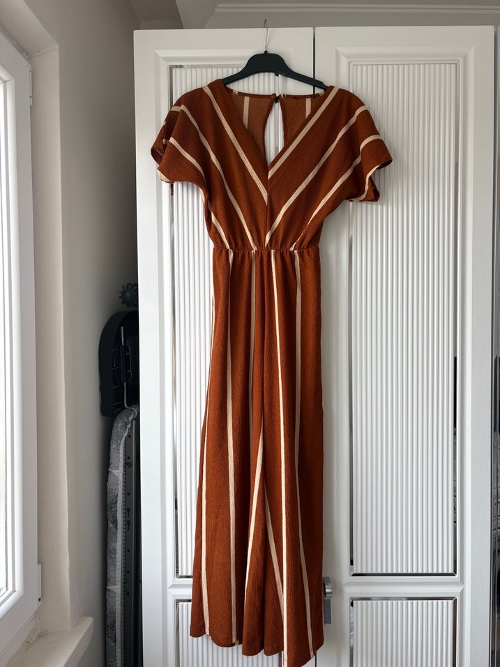 Parlak kahverengi çizgili, V yaka ve askılı, bol kesim uzun tulum. Bohem tarzda drapeli detaylara sahip.