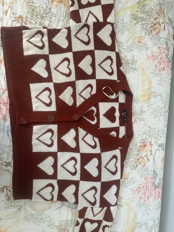 Fitted kesim, koyu kahverengi örgü hırka, V yakalı ve kalp desenli. Uzun kollu ve düğmeli, rahat bohem tarzı için ideal. ❤️