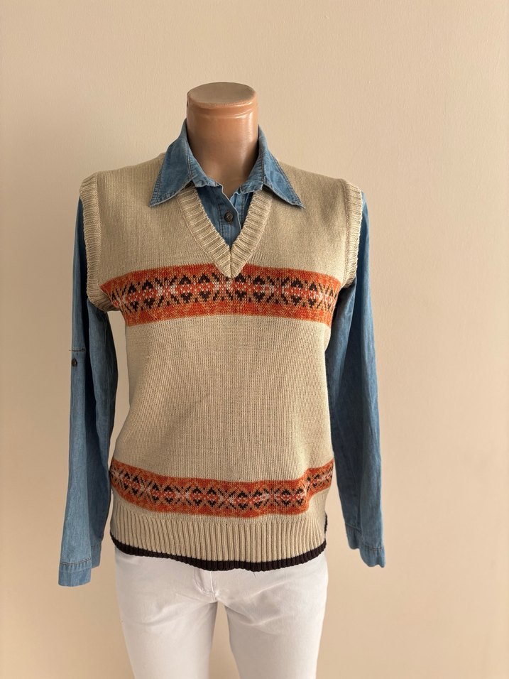 Bej renkte, V yakalı, kısa ve bol kesim triko süveter. Retro desenli bantlar bohem tarzını yansıtıyor.