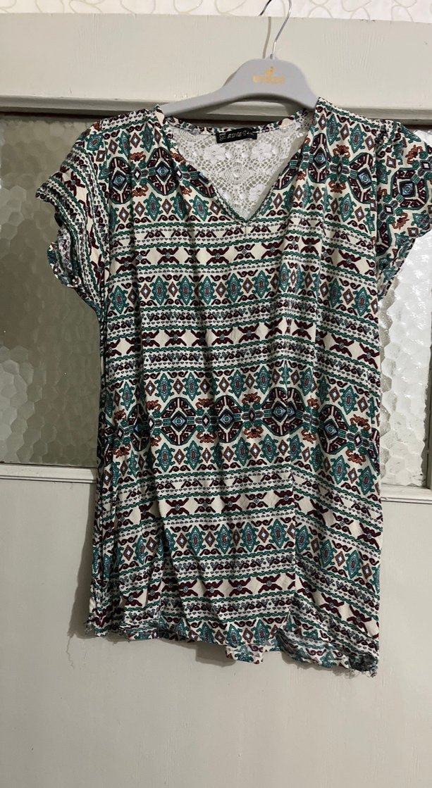 Kısa kollu, V yakalı bol kesim bluz. Koyu renkli çok renkli bohem batik desenli ve dantel detaylı. Tekstil kumaştan, günlük kullanım için uygun.