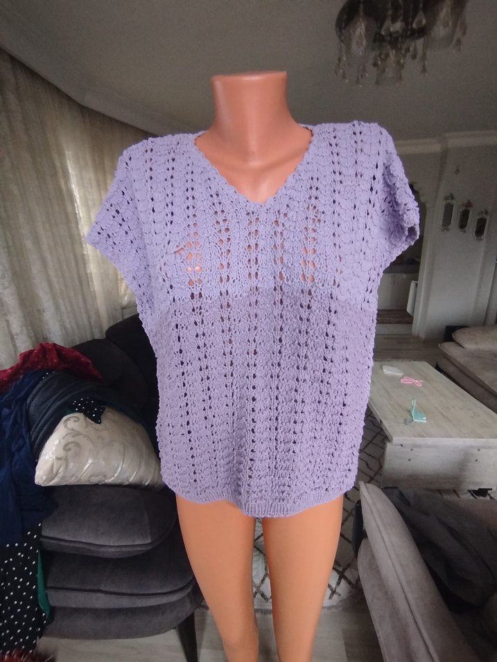 Bohem tarzda, gevşek kesim, kısa kollu ve V yaka. Yumuşak, pastel mor örgü kumaştan, günlük kullanıma uygun.