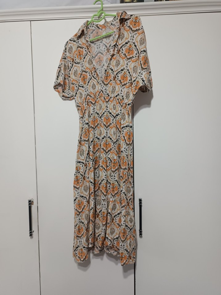 Bohem tarzda, bol kesim, kısa kollu ve V yakalı uzun elbise. Yumuşak sentetik kumaştan, düğmeli ve kahverengi yılan desenli. Günlük kullanım için uygun.