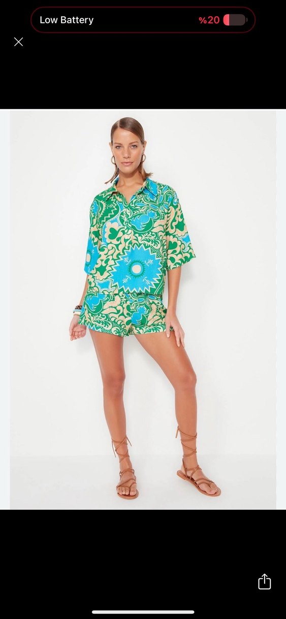 Bohem tarzı, düğmeli, V yaka ikili takım Turkuaz tonlarda tie-dye desenli, kısa kollu ve bol kesim, sentetik kumaştan üretilmiştir.