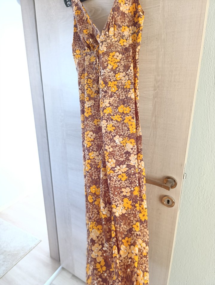 Bohem tarzda, koyu kahverengi tie-dye ve sarı çiçek desenli uzun elbise. Bol kesim, drapeli ve V yakalı, günlük kullanım için uygundur.