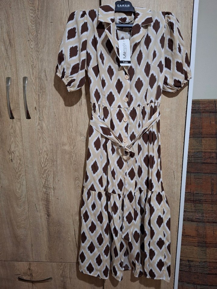 Kahverengi batik desenli uzun elbise, V yaka ve askılı kollara sahiptir. Kuşaklı ve bol kesimdir, yumuşak sentetik kumaştan üretilmiştir.