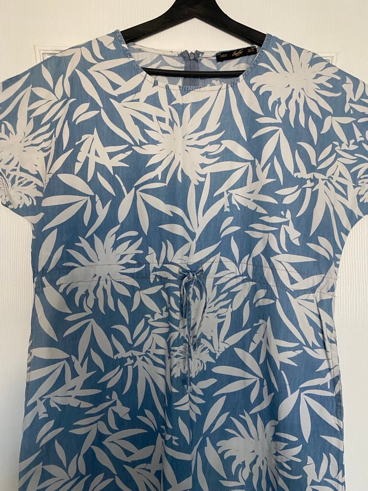 Mavi, beyaz çiçek desenli, bol kesim, V yakalı kısa kollu elbise Drapeli uzun model, günlük kullanım için uygun.