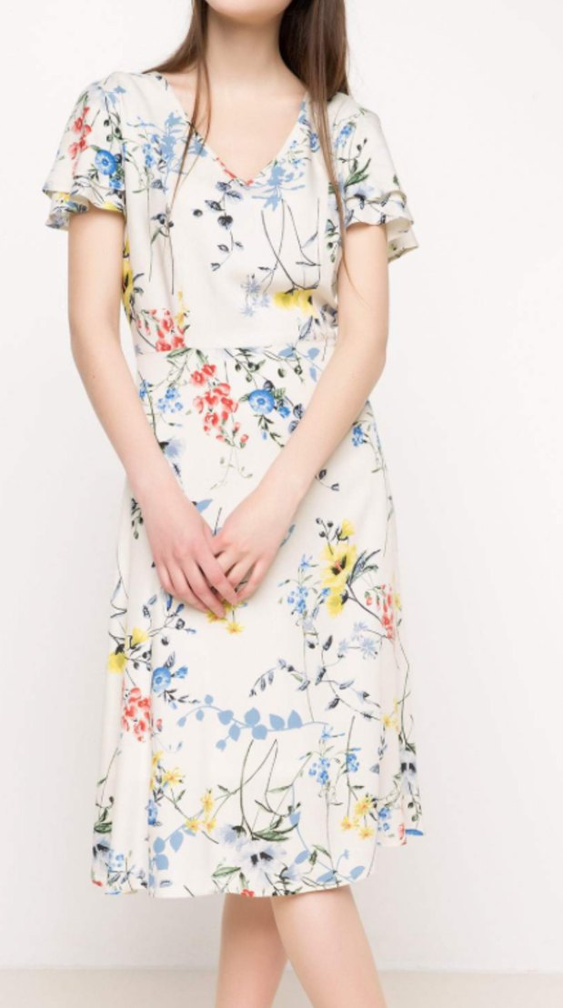 Beyaz midi elbise, V yaka ve kısa kollu, bol kesimdir. Pastel çiçek desenli ve drapeli tasarıma sahiptir, günlük veya düğün için uygundur.