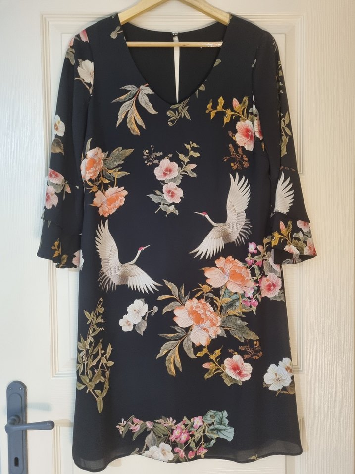 Yumuşak sentetik kumaştan, bohem tarzda, çiçek desenli, V yaka, kısa kollu ve dökümlü midi elbise rahat kesimle romantik akşamlar için uygun.