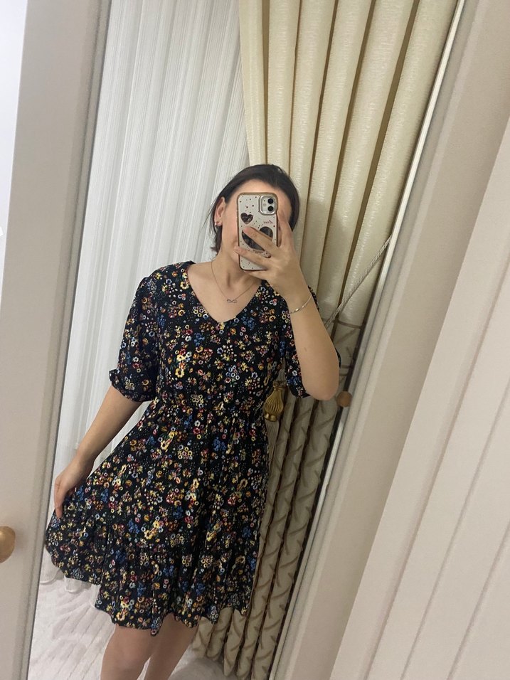 V yaka ve kısa kollu, bol kesim midi elbise. Koyu renkli çok renkli çiçek desenli, hafif şeffaf sentetik kumaştan yapılmıştır.