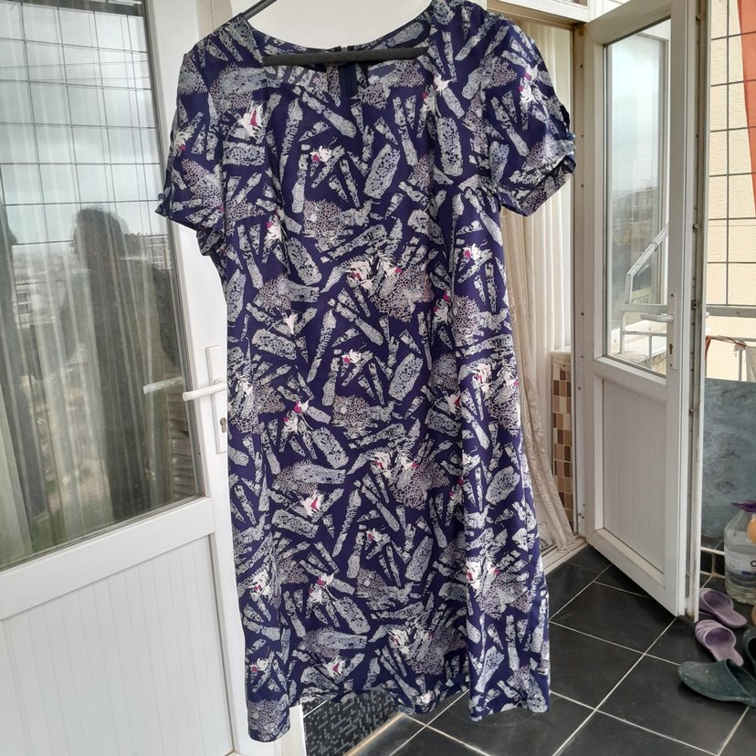 Mor ve gri tonlarda bağlama desenli, kısa kollu, V yakalı ve bol kesim midi bohem elbise. Günlük kullanıma uygun.