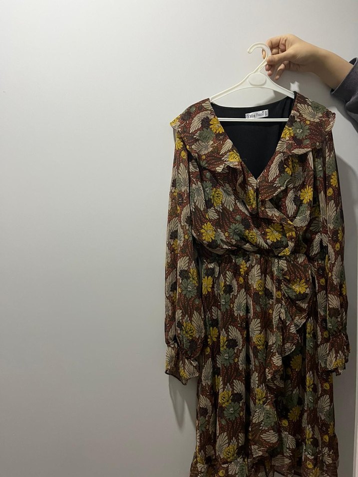 Uzun kollu, bol kesim midi elbise, drapeli ve çiçek desenli. V yaka ve kahverengi renkte, günlük kullanım için uygun bohem tarzda.