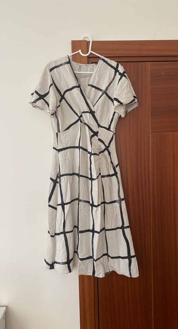 Krem rengi, asimetrik kareli, keten kumaştan, bohem tarzda, V yakalı, drapeli, kısa kollu, bol kesim midi elbise.