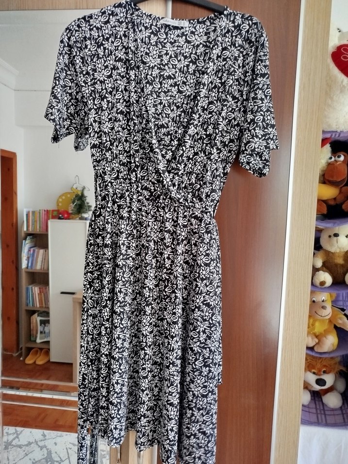 Gri midi elbise, bol kesim kısa kollu ve drapeli tasarıma sahiptir. V yaka ve baskılı desen ile gündelik bohem tarzına uygundur. renk siyah beyaz