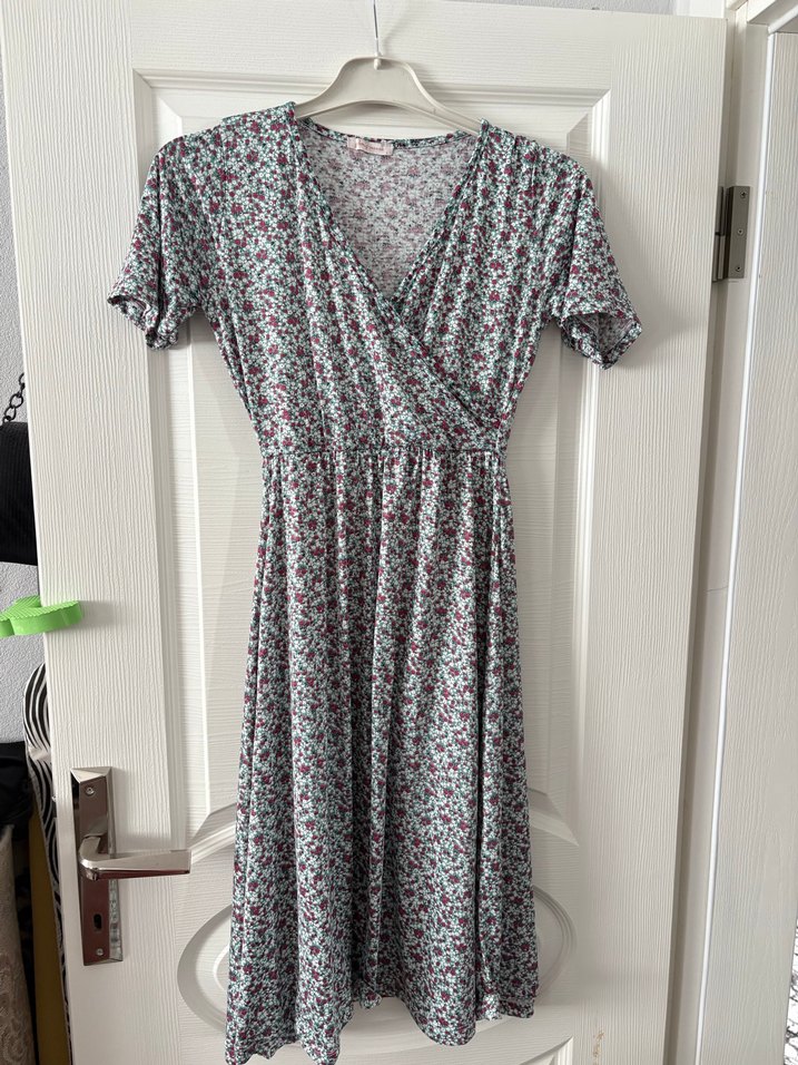 Bohem tarzda, kısa kollu ve V yakalı mini elbise. Yumuşak sentetik kumaştan, gri batik desenli ve bol, drapeli kesime sahip.