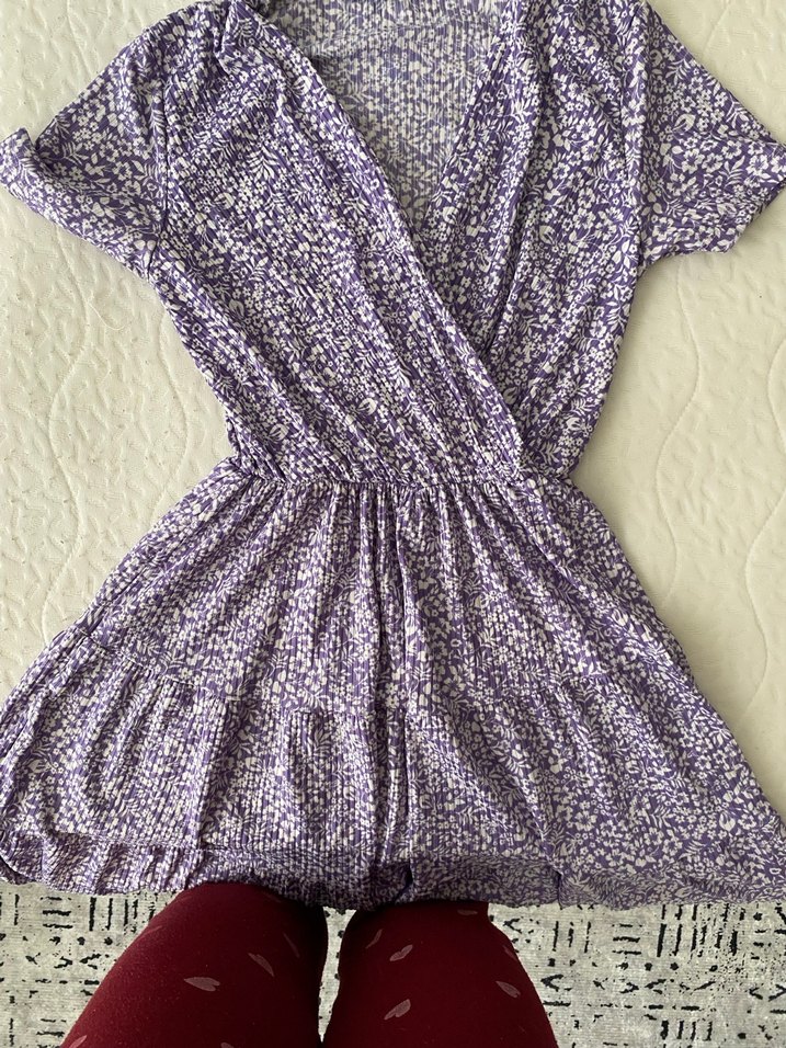 Bohem tarzı, drapeli, mor midi elbise. Kısa kollu, V yakalı ve pastel tonlarda batik desenli, yumuşak sentetik kumaştan yapılmıştır.