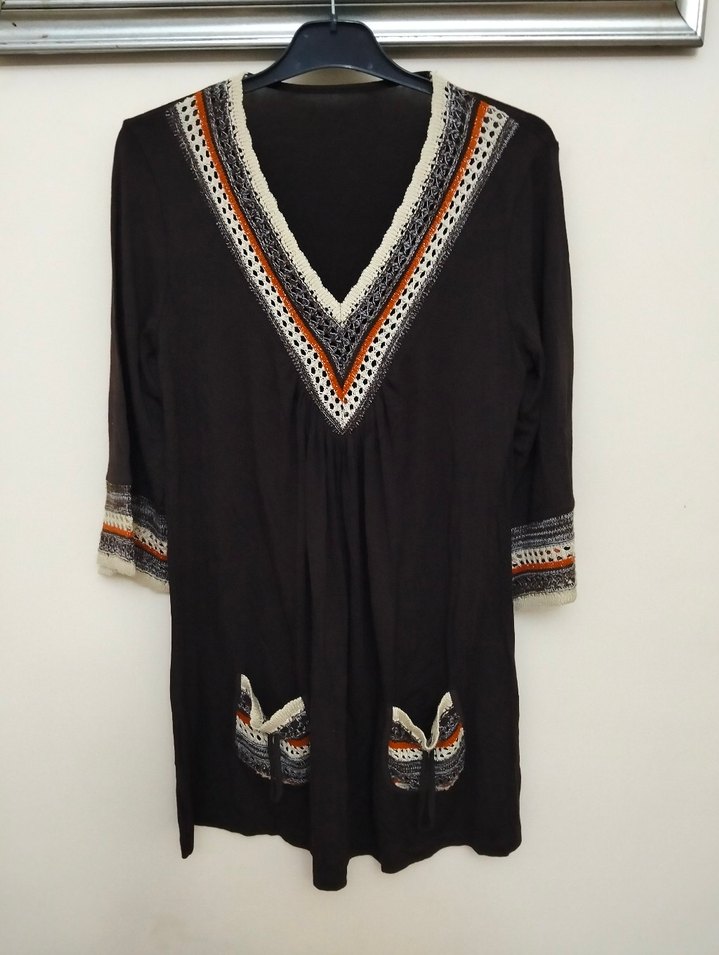 Kahverengi triko tunik,elbise V yaka ve nakış detaylarıyla uzun kollu. Bol kesim ve midi boyda, günlük kullanım için bohem tarzda rahat bir model. M-L beden uyumlu.... beden yazmıyor. Marka temsili.