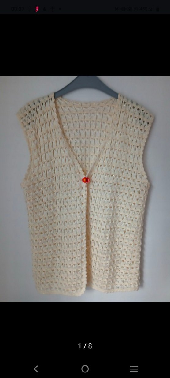 V yaka ve kolsuz tasarıma sahip, örme kumaştan yapılmış, bol kesim beyaz yelek. Bohem tarzıyla vintage ve hippie stillerine uygundur, günlük kullanıma idealdir. çeyizlik el örgüsü