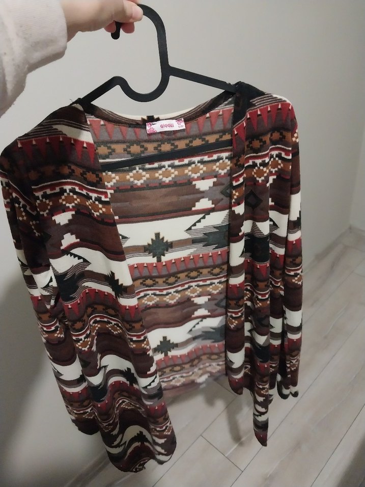 Koyu kahverengi, örgü dokulu bohem hırka, bol kesim ve uzun kollu. V yaka ve batik desenli, midi boyda, günlük kullanıma uygun.