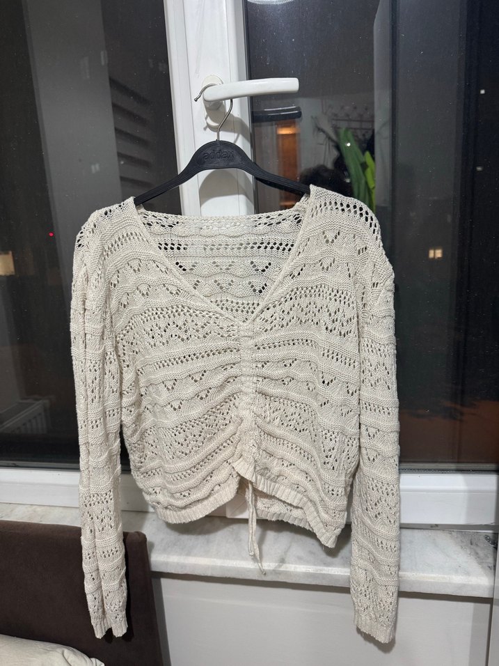 Bej renkli, uzun kollu ve V yakalı örgü kadın kazak. Bol kesim ve kısa boyuyla bohem tarzını yansıtır, günlük kullanıma uygundur.