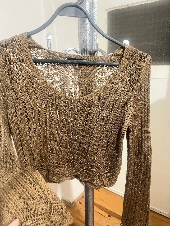 Bohem tarzda, V yakalı, uzun kollu ve kahverengi örgü, vücuda oturan rahat kadın kazak.