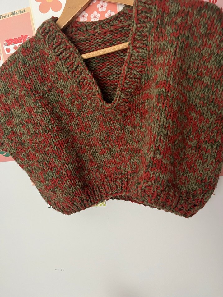 V yaka ve bol kesim özellikli, kahverengi ve haki karışımı örgü bohem kadın süveter. Kısa boyuyla modern bir görünüm sunar. El örgüsü annem ördü