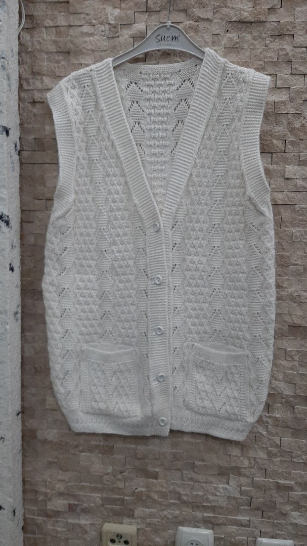 Düğmeli, cepli, bohem tarzda, V yaka, örme, kolsuz, bol kesim, beyaz-gri tonlarında kadın yelek. Rahat ve günlük kullanım için uygundur. rengi kırık beyazdir
