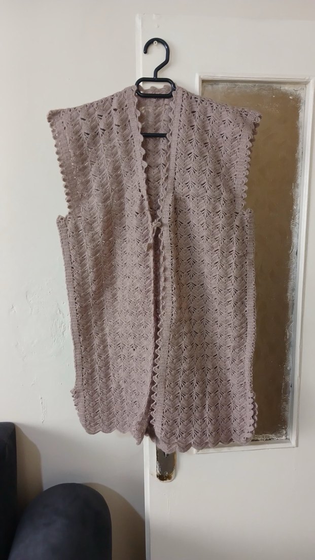 Bej renkli, V yakalı, midi boy, bol kesim örgü kadın yelek. Rahat ve bohem tarz için uygundur. El örgüsü el emeği
