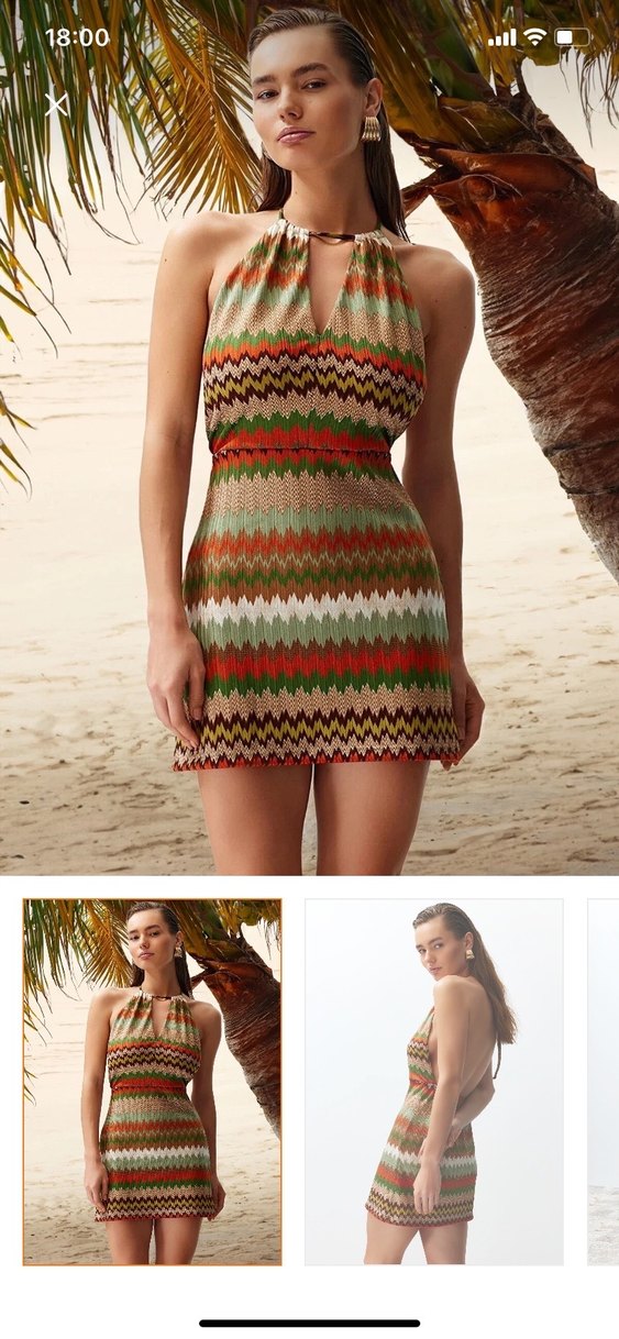 Bu sıkı oturan bohem mini elbise, askılı halter yaka ve örgü tie-dye desenine sahip. Hafif çok renkli ve yumuşak örgü kumaftan, açık hava etkinlikleri için uygun.