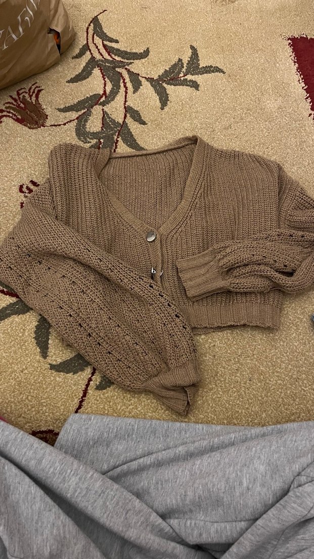 Bu kahverengi örgü hırka, bol kesim, uzun kollu ve V yaka detaylarına sahip, yumuşak örme kumaştan kısa boydadır. Bohem tarzıyla günlük kullanıma uygundur.