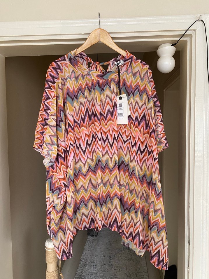 Bu bol kesim kadın bluz, pilili tasarım, V yaka ve kısa kolludur. Hafif, çok renkli bağlama deseniyle bohem ve retro tarz sunar, günlük kullanıma uygundur.