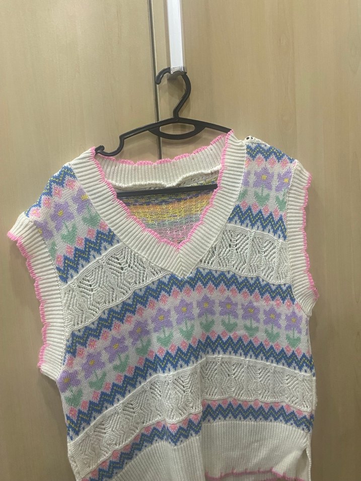 Kadınlar için V yakalı, renkli örgü, bol kesim ve kolsuz süveter. Bohem tarzını yansıtan pastel renkler içerir. Hiçbir sıkıntısı yok