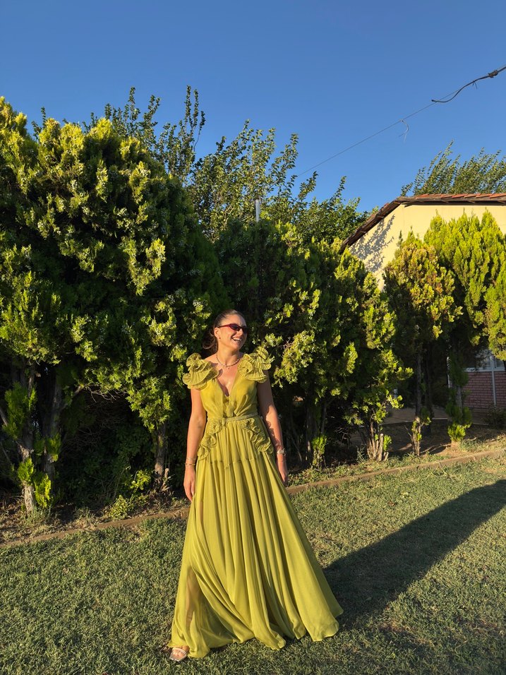 Bu uzun haki elbise, drapeli tasarımı, V yakası ve kolsuz kesimiyle salaş bir uyum sunar. Parlak kumaşı ve bohem tarzı düğünler için uygundur.