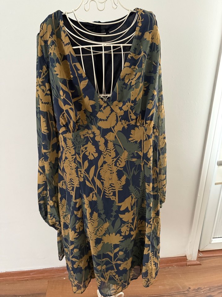 Sentetik kumaştan, V yaka, bol kesim, dökümlü kadın elbisesi. Koyu haki renkli, baskılı ve bohem tarzda, sonbahar kış hava için uygun.