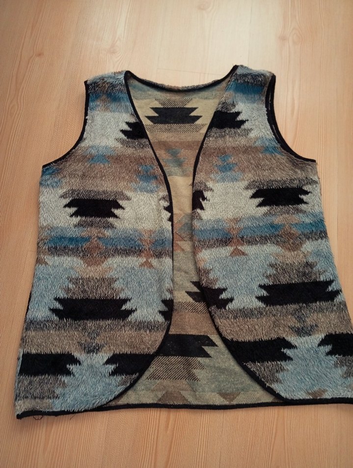Kolsuz, örme kumaştan yapılmış ve bağlama desenli bu yelek, V yakaya ve bol kesime sahiptir. Günlük kullanıma uygun bohem tarzda bir üründür.