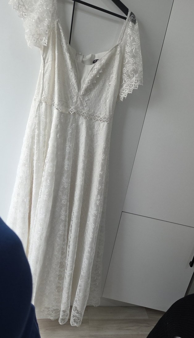 Uzun A kesim, V yaka ve kısa kollu bu gelinlik, ince dantel detaylara sahip. Bohem tarzda, rahat kesimiyle hafif beyaz renkte, vintage bir hava sunar.