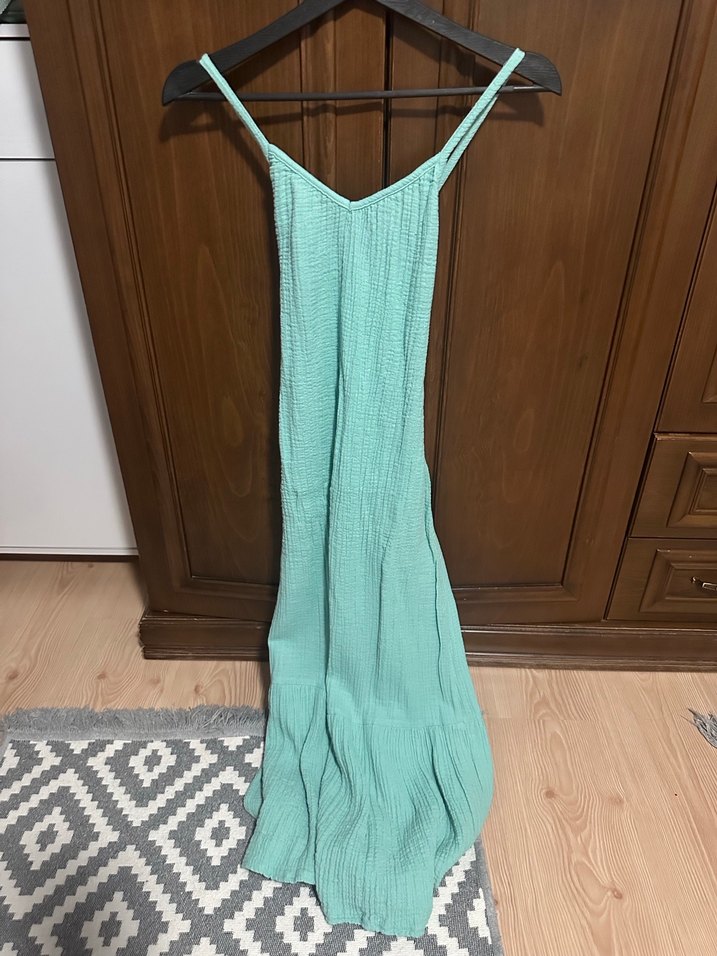 Turkuaz renkte, V yakalı, askılı, drapeli, arkası çapraz detaylı, ince dokulu bohem tarzda uzun elbise. bir defa giyildi. bir defosu yoktur.