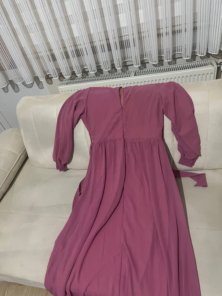 Bordo renkte, v yaka ve salaş kesime sahip uzun elbise. Drapeli tasarımı ve askılı kollarıyla bohem vintage tarzını yansıtır. Düğünler için uygundur.