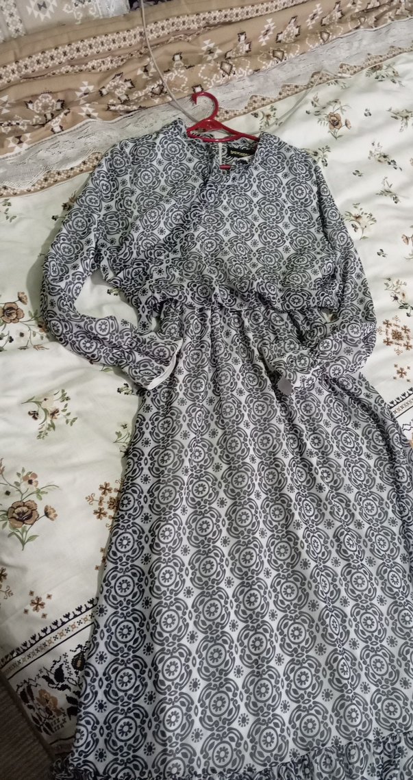 Uzun, bol kesim elbise, desenli gri kumaş ve drapeli tasarıma sahiptir. Uzun kollu ve V yakalı, bohem tarzda. Günlük kullanım için uygun.