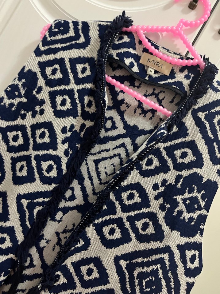 Uzun, kolsuz ve dökümlü V yaka bohem tarzda, koyu mavi tie-dye desenli, bol kesim yelek. Tekstil malzemeden üretilmiştir.