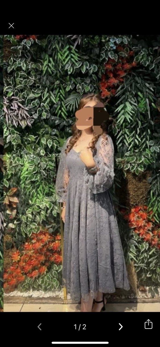 V yaka, bol kesim, drapeli uzun kollu gri elbise. Yumuşak sentetik kumaştan, bohem düğünler için tie-dye desenli.