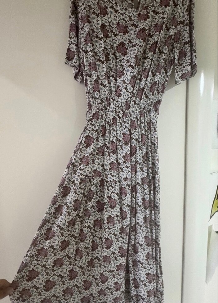 V yaka, kısa kollu, bol kesim uzun elbise, dökümlü tasarım ve bej ile gri tonlarında vintage çiçek desenli, Hiç bir deformesi yok.