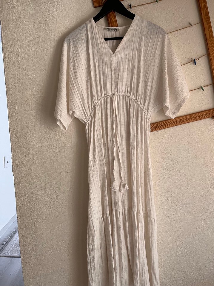 V yaka, pileli detaylı, keten kumaştan bol kesim uzun elbise. Hafif beyaz rengiyle bohem tarzı için uygun. 1 kez giyildi