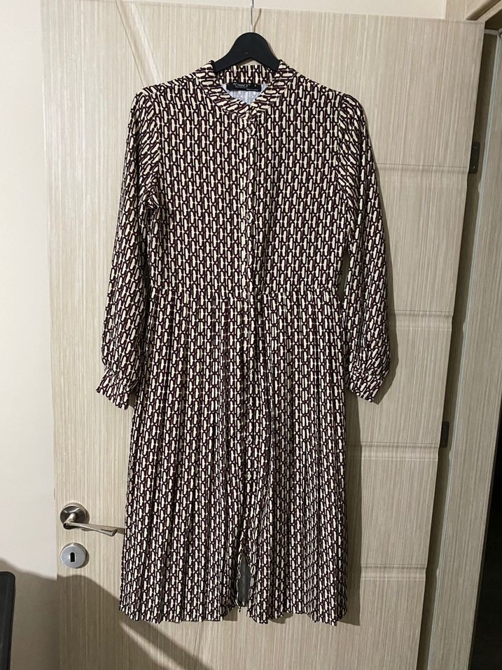 Uzun kollu, pileli ve bol kesim bohem elbise. V yaka ve koyu kahverengi yılan desenlidir, sentetik kumaştan üretilmiştir.