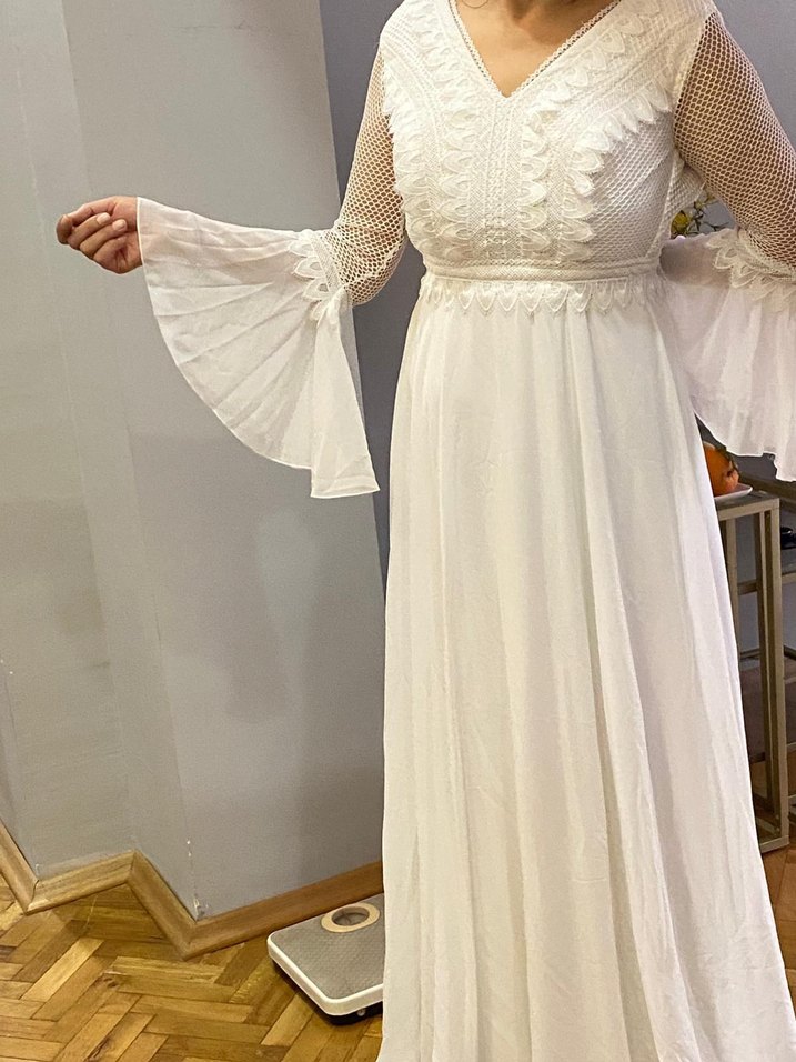 Bu uzun beyaz gelinlik, V yaka ve uzun, bol kollara sahip bohem tarzda tasarlanmıştır. Hafif ve zarif dantel detayları bulunur.