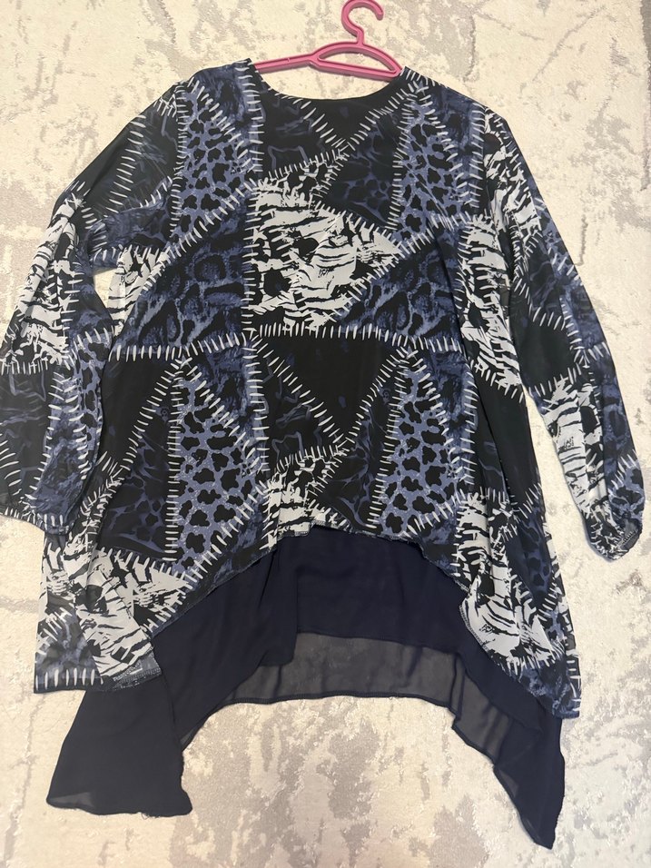 Bohem tarzda, V yakalı, uzun kollu, dökümlü ve desenli koyu mavi bluz.