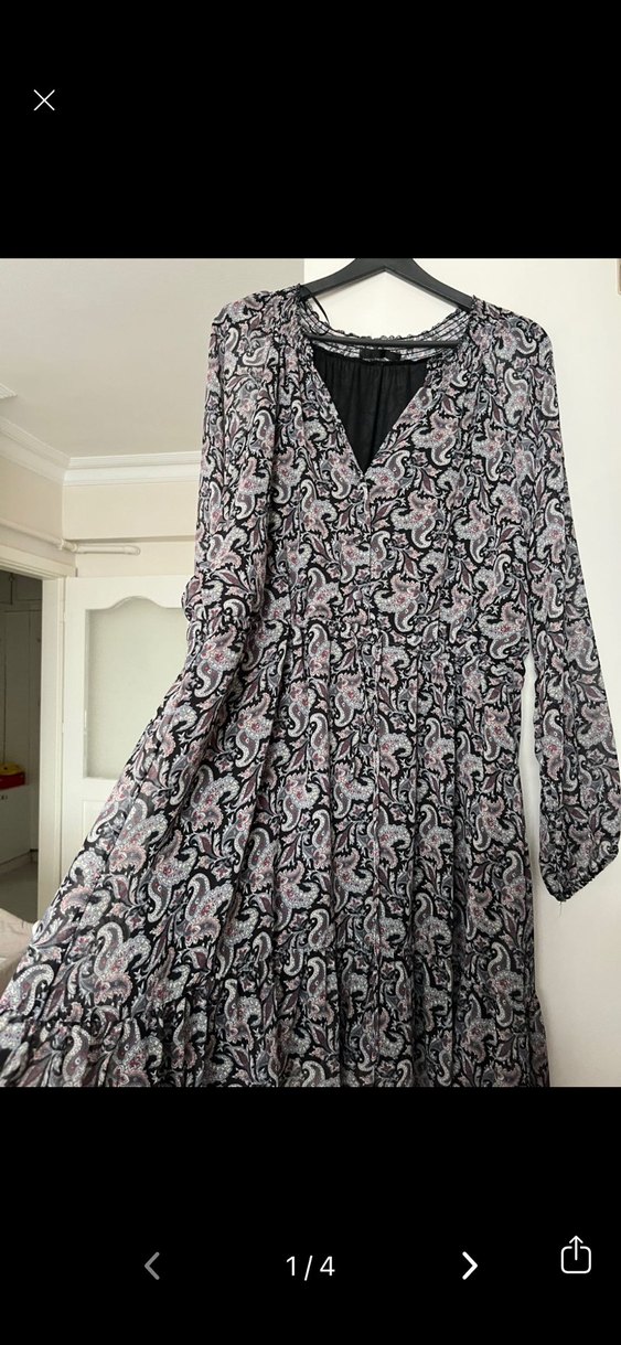 Bohem tarzı, V yakalı, uzun kollu ve desenli uzun elbise. Rahat kesimli, yumuşak sentetik kumaştan yapılmış, gri ve çok renkli, drapeli tasarım.156cm boyum diz altıma geliyor