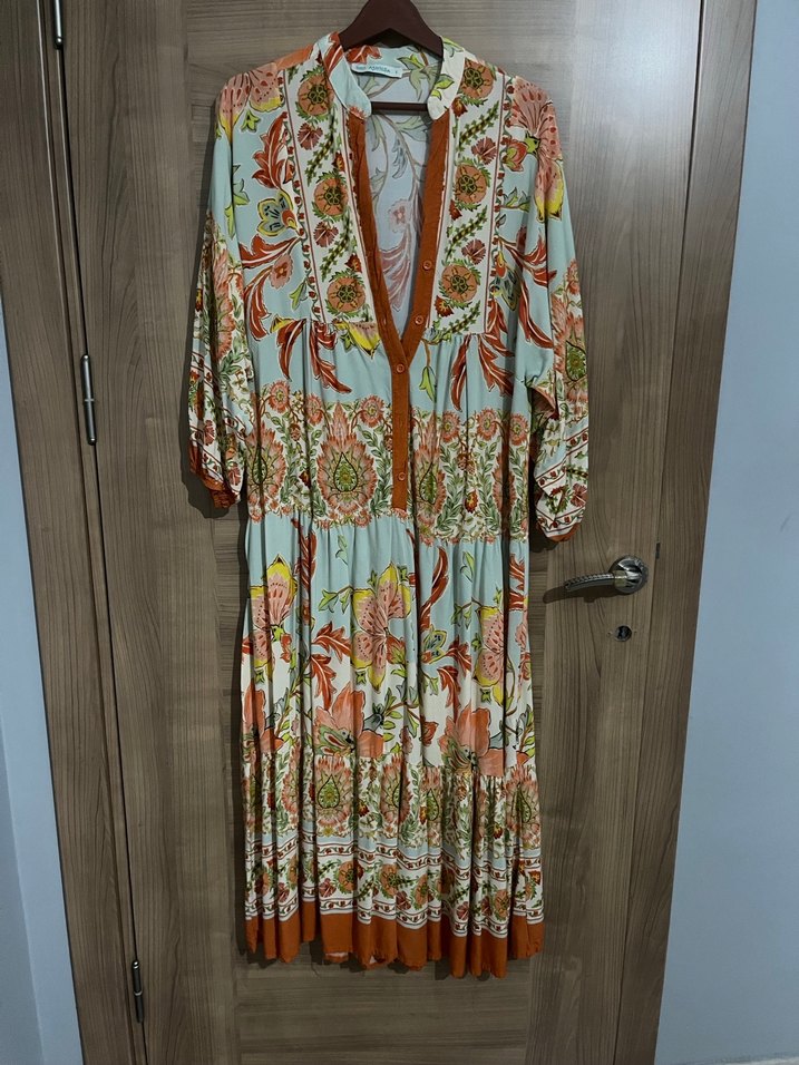 Pastel renklerde çiçek desenli, V yakalı ve bol kesim uzun bohem elbise.