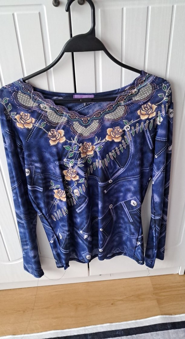 Uzun kollu, V yakalı, bol kesim kadın bluz. Koyu mavi batik desenli, çiçek ve dekoratif detaylara sahip, düğmeli, bohem tarzda.