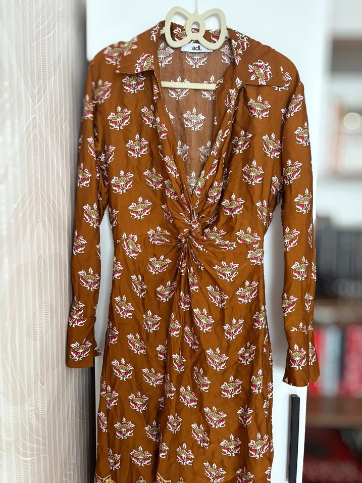 Bohem tarzda, V yakalı ve uzun kollu, dökümlü kesime sahip kahverengi desenli uzun elbisedir. Günlük kullanıma uygundur.